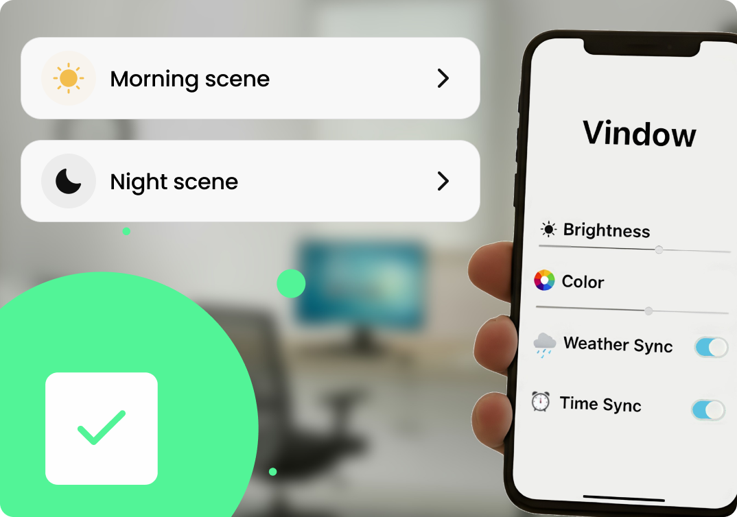 Absolutely. While Vindow works automatically out of the box, the companion app gives you full manual control. Adjust brightness, color temperature, set custom schedules, or switch between different lighting scenes to match your preferences or activities.