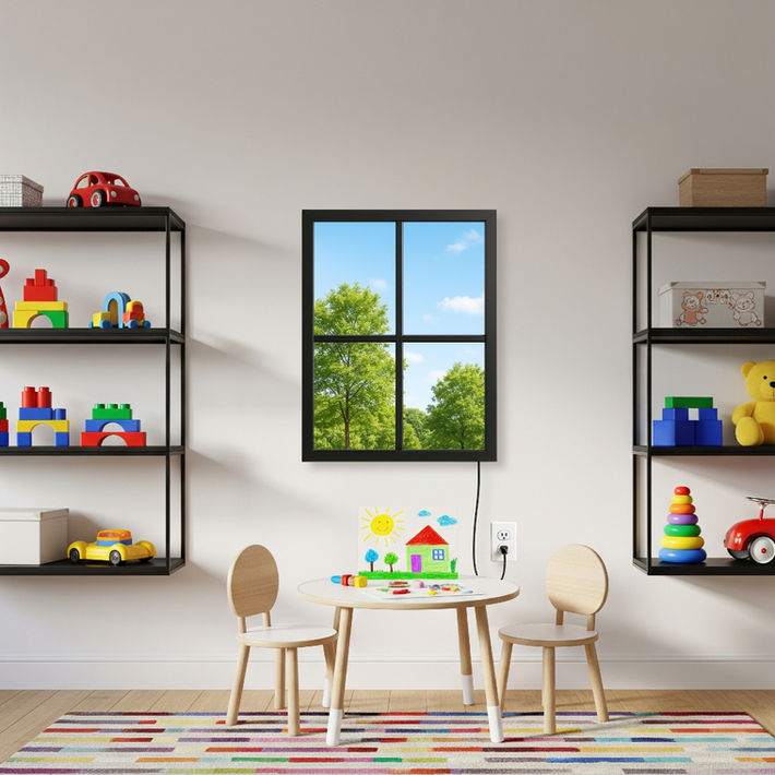 חלון וירטואלי . פאנל תאורה חכם שמרגיש כמו חלון אמיתי, המסתנכרן אוטומטית דרך Wi-Fi ומשקף את מזג האוויר והשעה ביום.